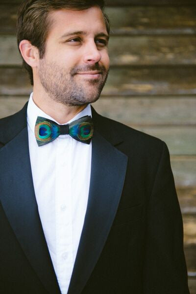 This bow tie is black with eye feathers showcasing green, deep violet and gold hues. Also has subtle blue tones on the inside of the tie.