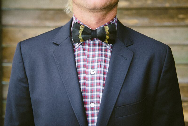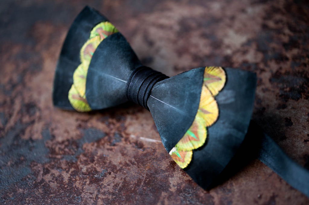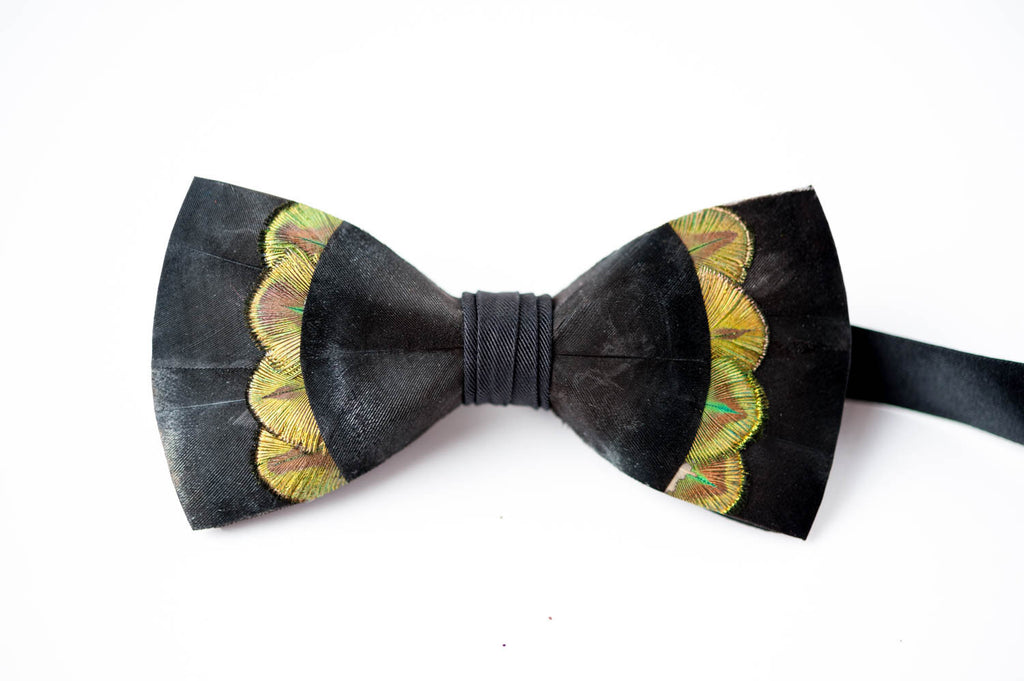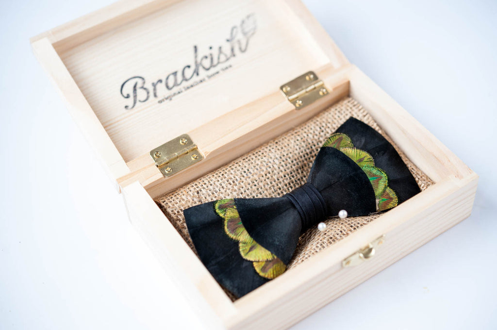 Holding true to Brackish tradition, the Mantis is another design sure to add a tasteful twist to your next formal event. A distant cousin of our Slate, we hand select a symmetrical row of greenish gold peacock plumage to be complemented on either side by jet black turkey feathers. The result is simple and unique, a subtle statement piece for a timeless look.